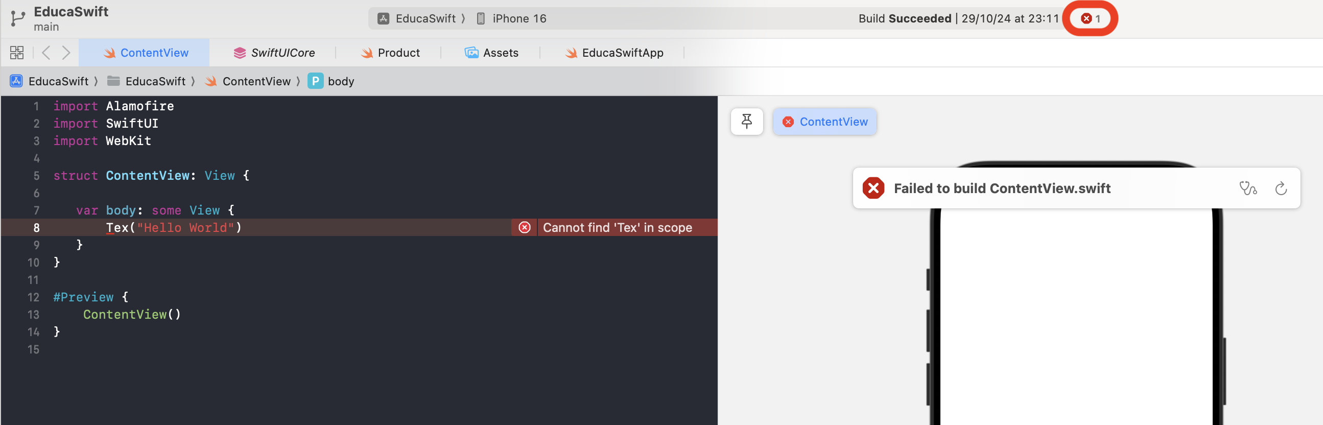 On the bar at the top we can select the simulator or device to run our App. Next to devices, we can see the selected Scheme ("EducaSwift"), a concept that will explain later.