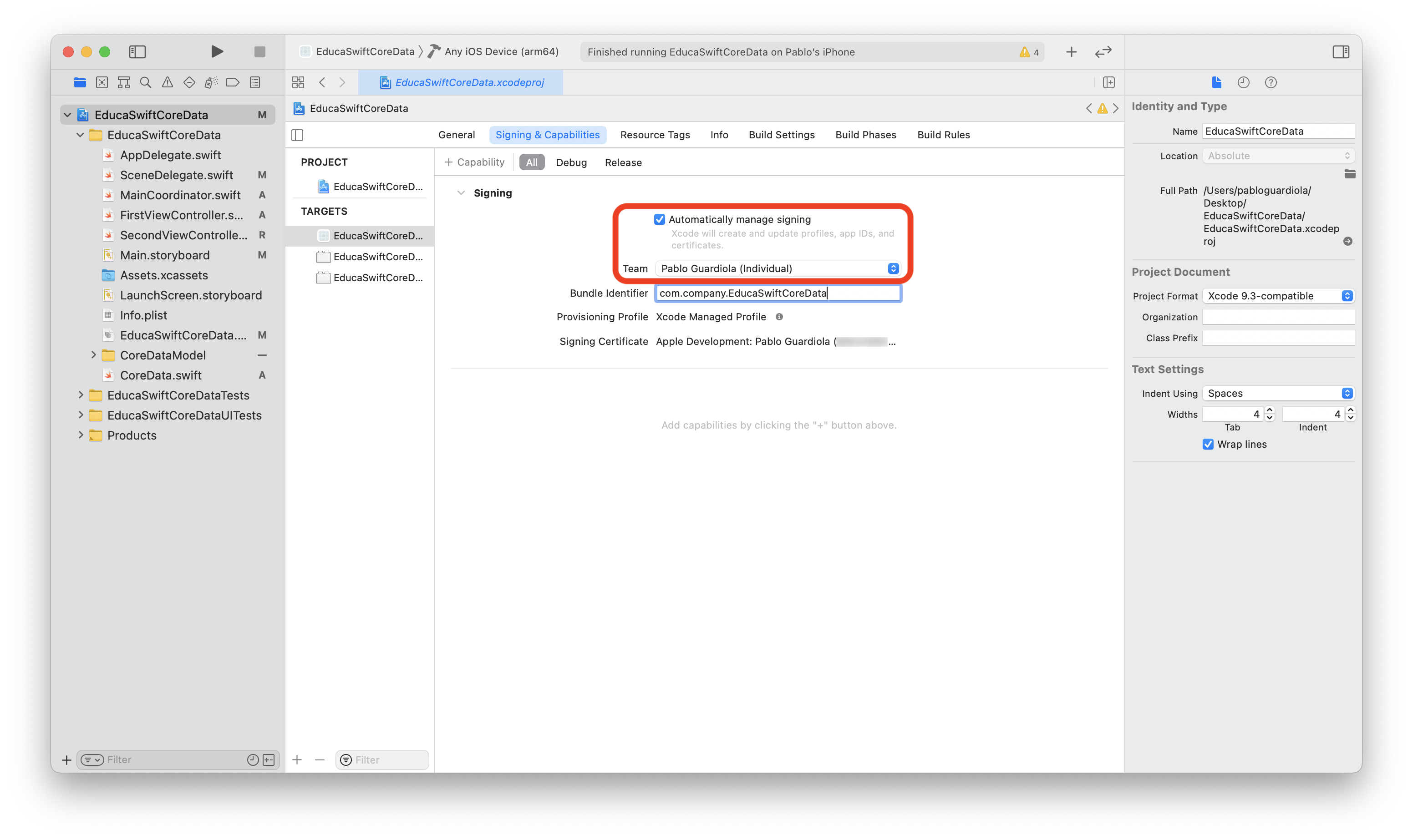 Once the account is added, select it as your Team and enable the "Automatically manage signing" checkbox in the Signing & Capabilities section. Xcode will automatically create the necessary certificates and use them when we launch our app.
