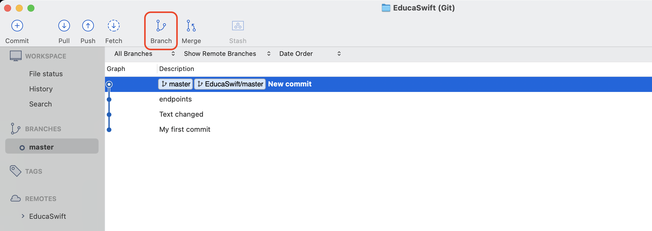 As you can see, once we've created our branch, it becomes bold, indicating that if we make a commit, it will be created on this branch and not on master.